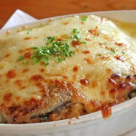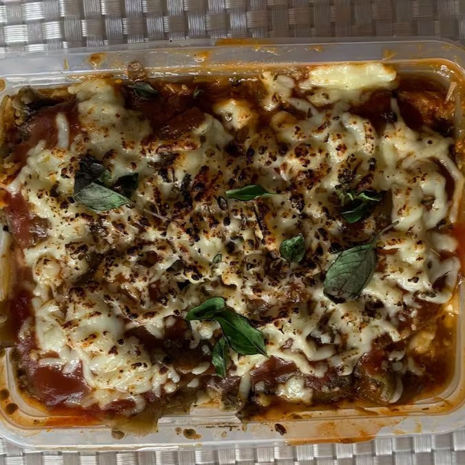 Saborosa Lasanha de berinjela recheada com duas opções escolhida pelo cliente: de carne de patinho moída com tempero especial ou de frango desfiado.