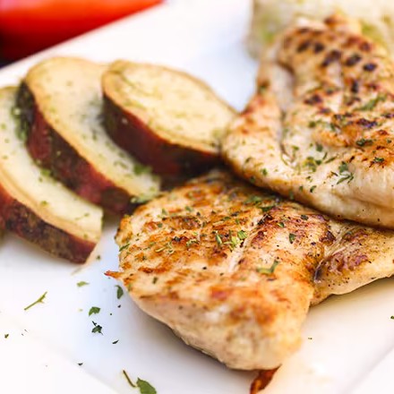 Batata doce com frango grelhado.