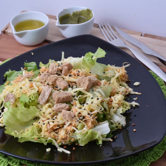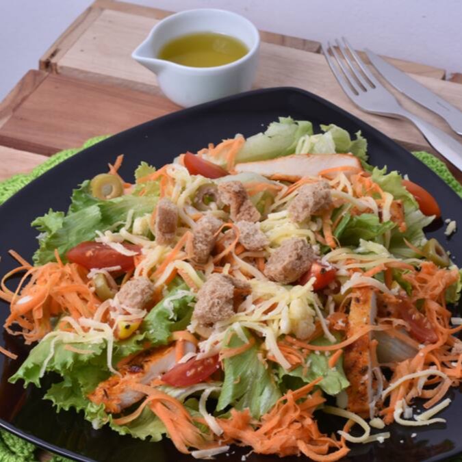 Frango desfiado, alface americana, queijo mussarela, croutons, alho torrado e gergelim negro.