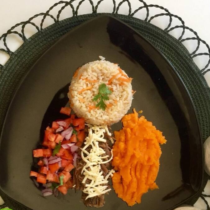 Purê de abobora, arroz integral de cenoura, vinagrete, carne de sol acebolada e queijo coalho light.