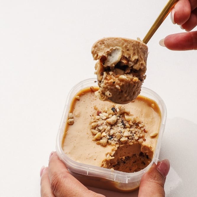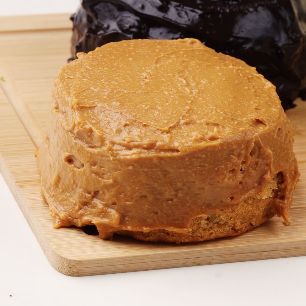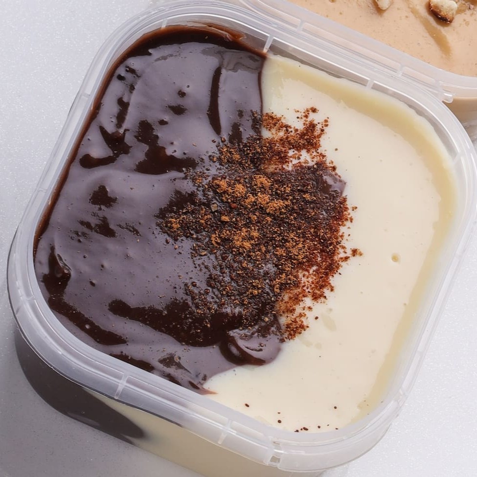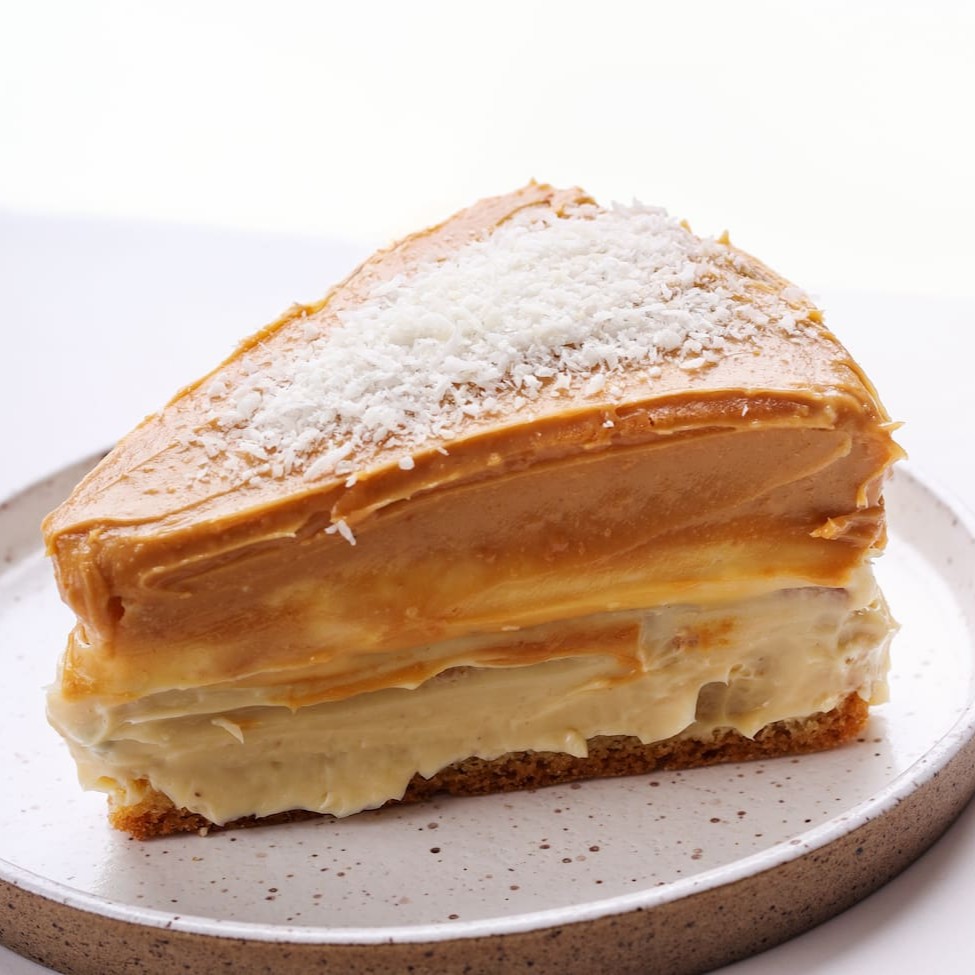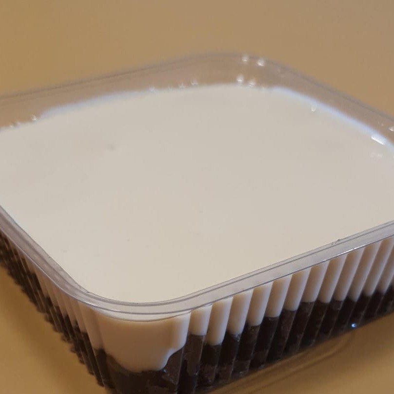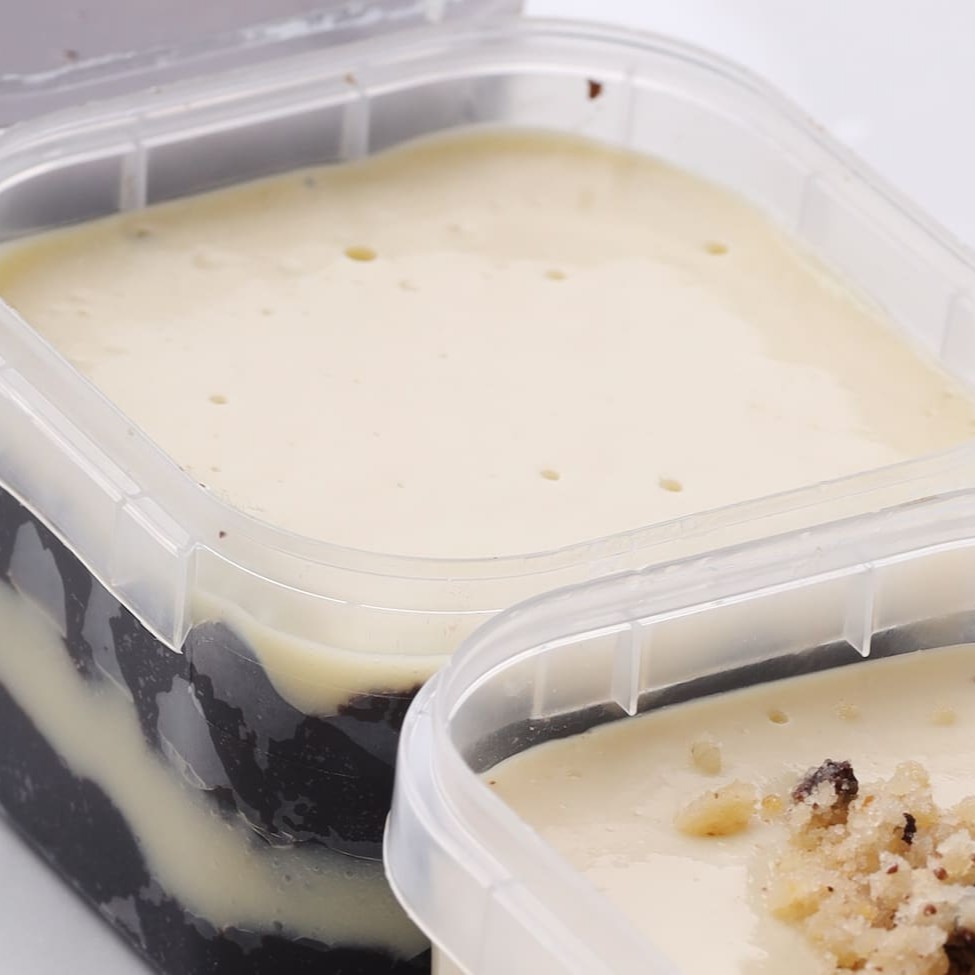 Biscoito maisena vegano, composto lácteo zero lactose, biomassa de banana verde, iogurte desnatado zero lactose, cacau em pó 100%, mel creme de leite zero lactose.