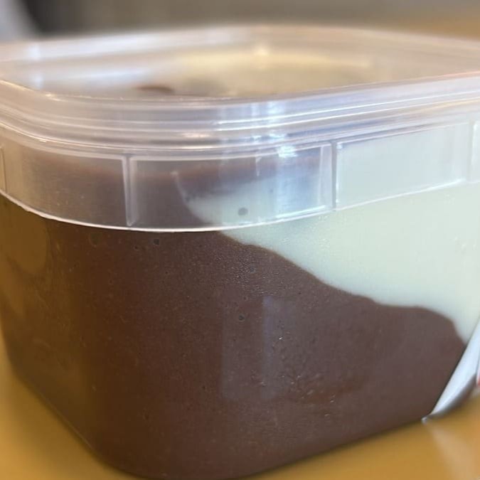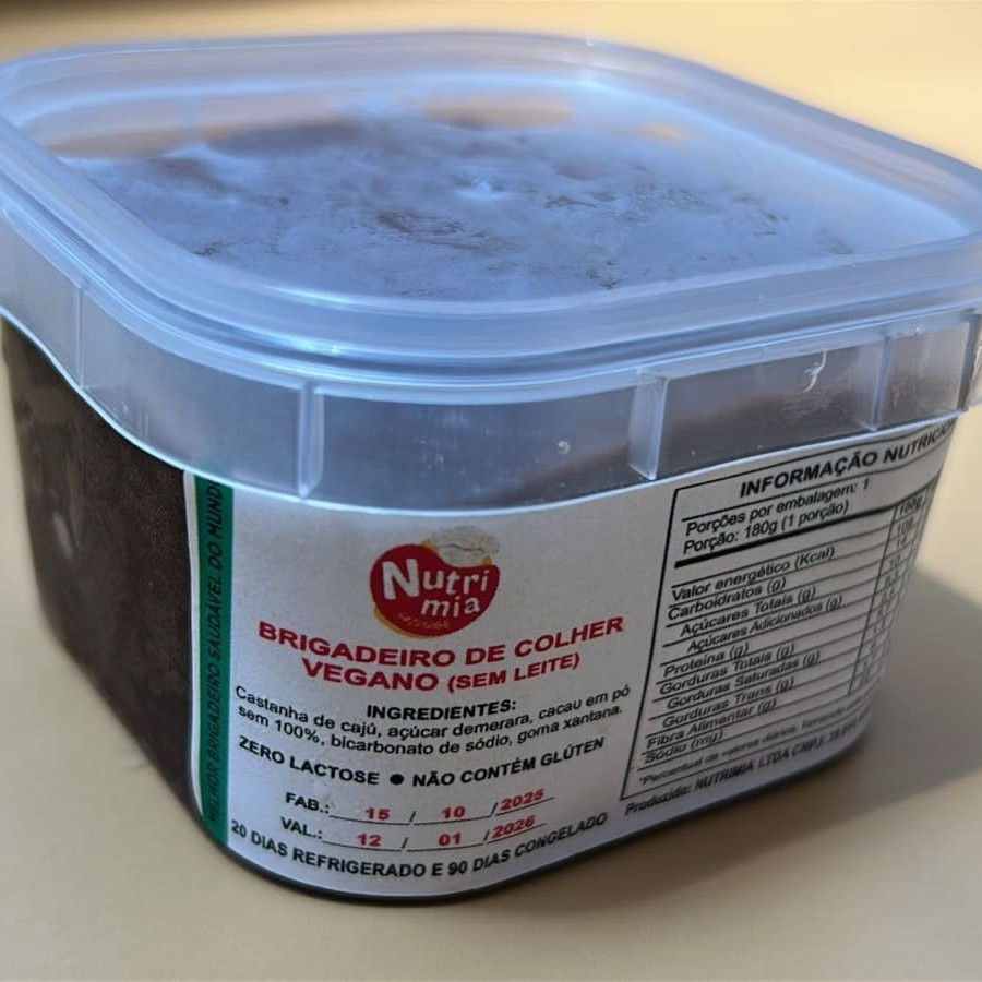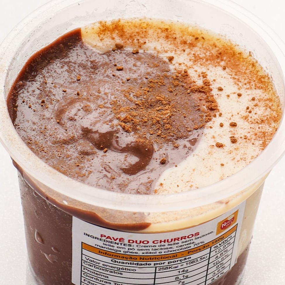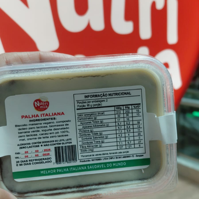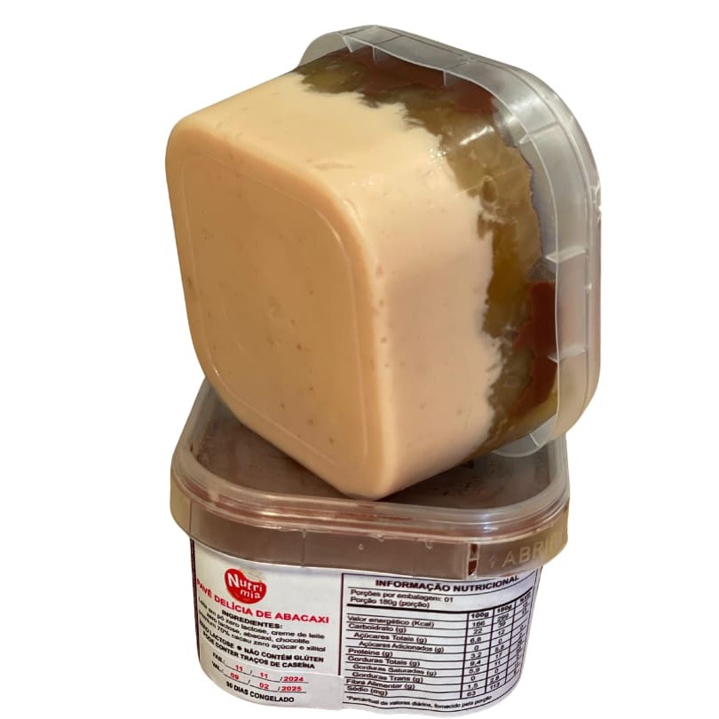 Ingredientes: Biomassa de banana verde, creme de leite zero lactose, composto lácteo zero lactose, Iogurte desnatado zero lactose, cacau em pó 100%, mel. Kcal: 163 por porção (180g). Alérgicos: Contém derivados do leite zero lactose; não contém glúten.