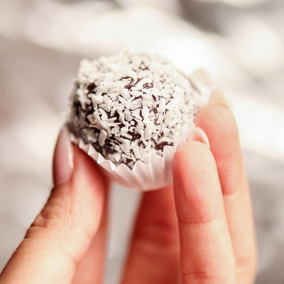 Caixa com 4 unidades, contendo 28g cada, feito com: creme de leite Zero lactose, coco ralado, leite em pó zero lactose, manteiga Ghee