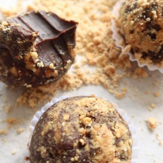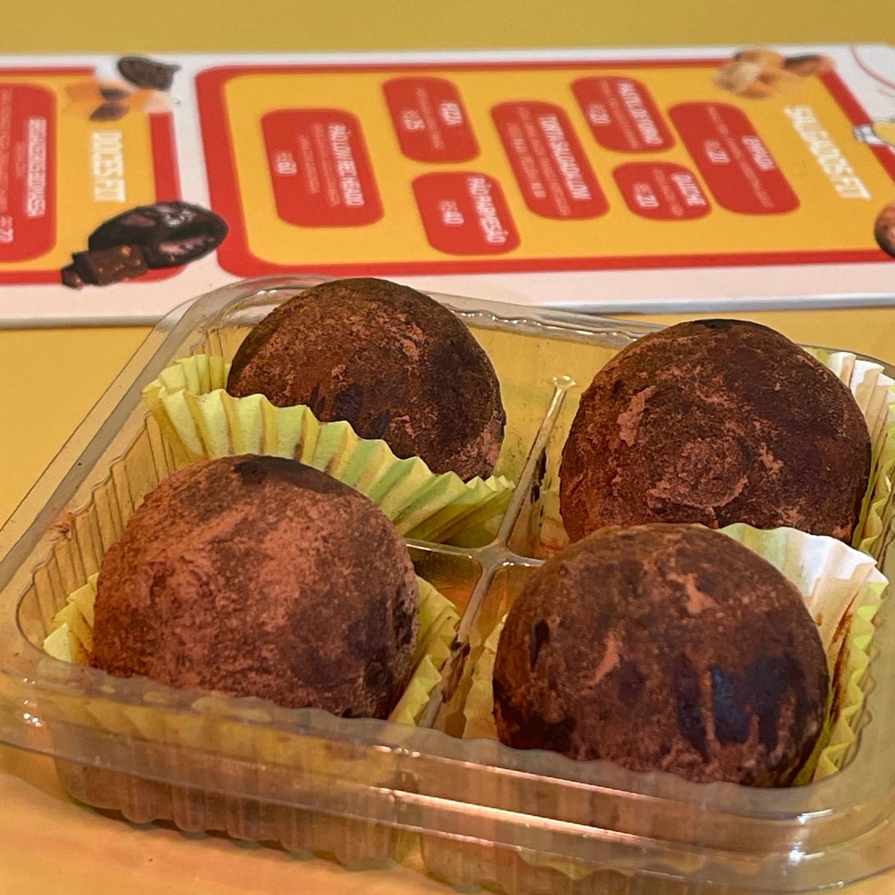 Caixa com 4 unidades , contendo 28 g cada, feito com: biomassa de banana verde, cacau em pó 100 por cento, mel, paçoca zero, Manteiga Ghee