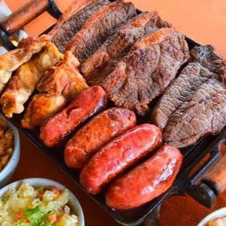 Acompanhamentos: arroz, feijão tropeiro, macarrão, farofa, vinagrete e batata palha