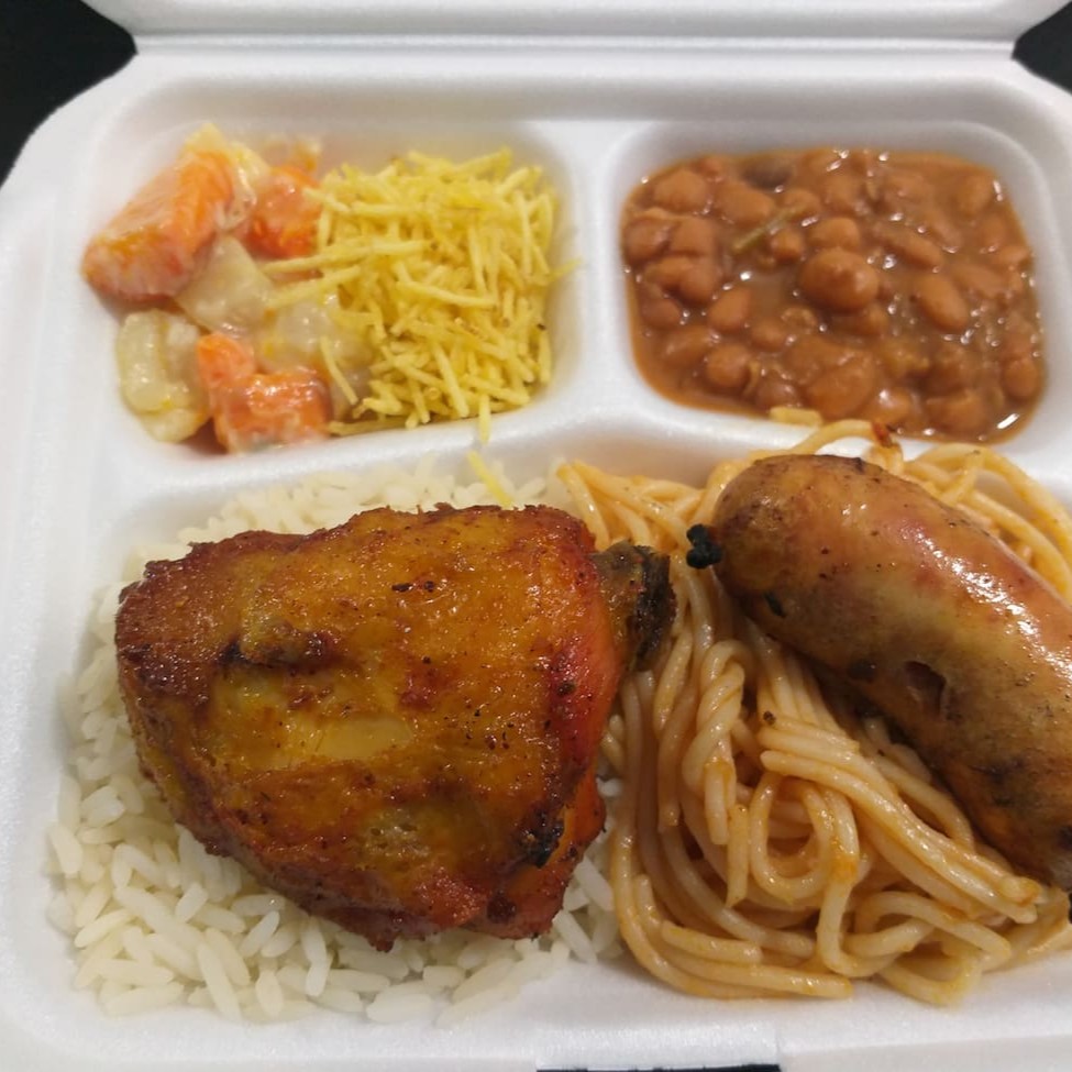 Acompanhamentos: Arroz, feijão macassar com farofa, macarrão e salada.