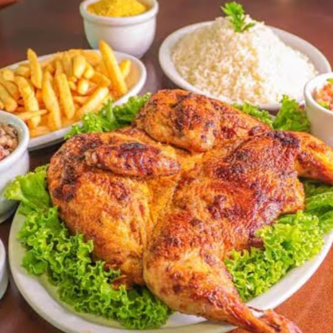 Delicioso galeto assado na brasa e banhado em manteiga de garrafa, acompanha crocantes batatas fritas, feijão arroz, farofa e vinagrete.