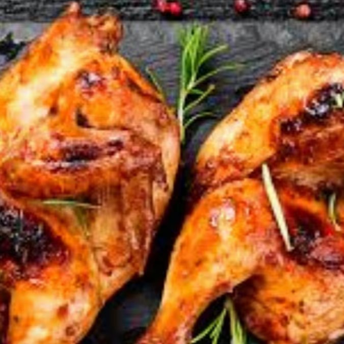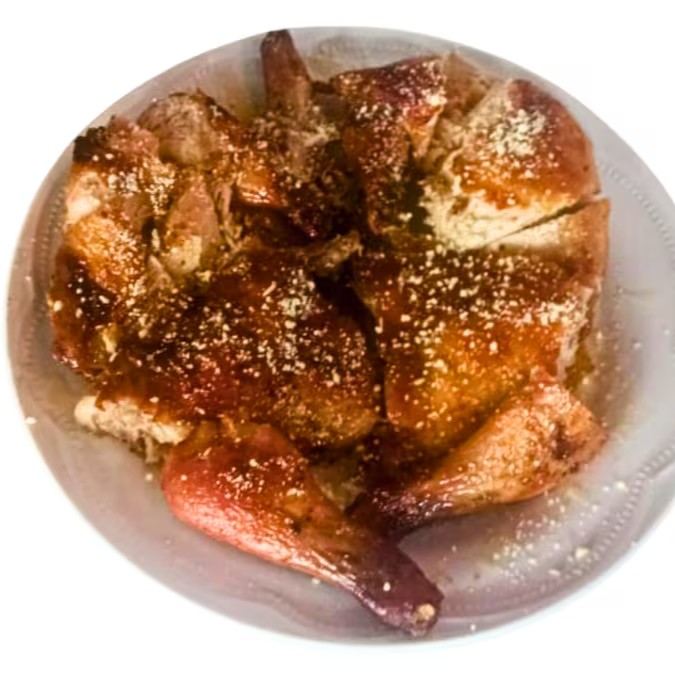 Meio galeto assado na brasa e banhado em manteiga de garrafa, acompanha farofinha e vinagrete.