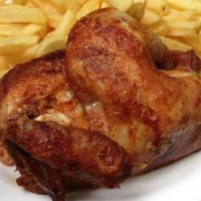 Meio galeto assado na brasa e banhado em manteiga de garrafa, acompanha crocantes batatas fritas, feijão arroz, farofa e vinagrete.