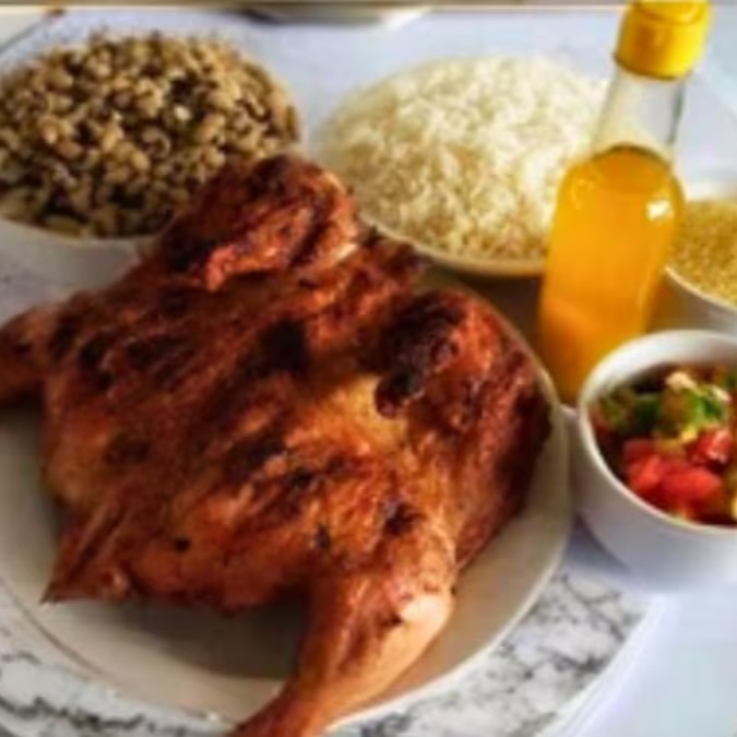 Meio galeto assado na brasa e banhado em manteiga de garrafa, acompanha feijão, arroz, farofa e vinagrete.