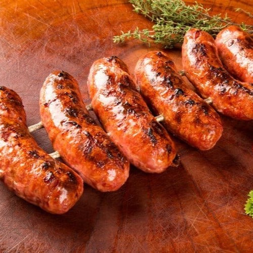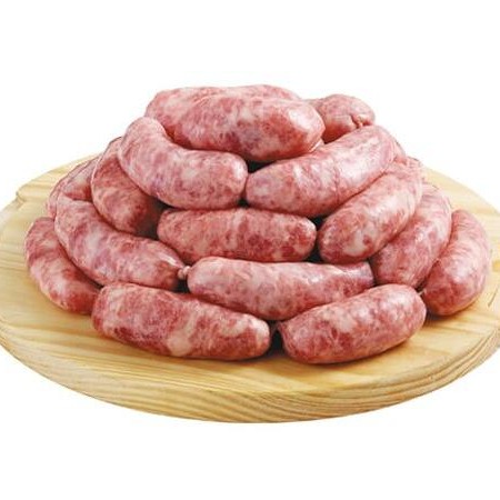 Linguiça de Frango, feijão macassar, arroz refogado, vinagrete, farofa e batata frita.
