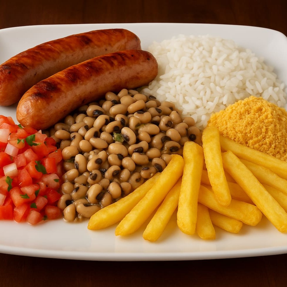 Linguiça suína, feijão macassar, arroz refogado, vinagrete, farofa e batata frita.
