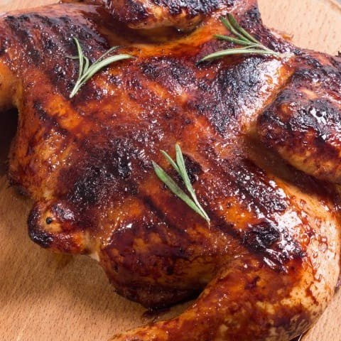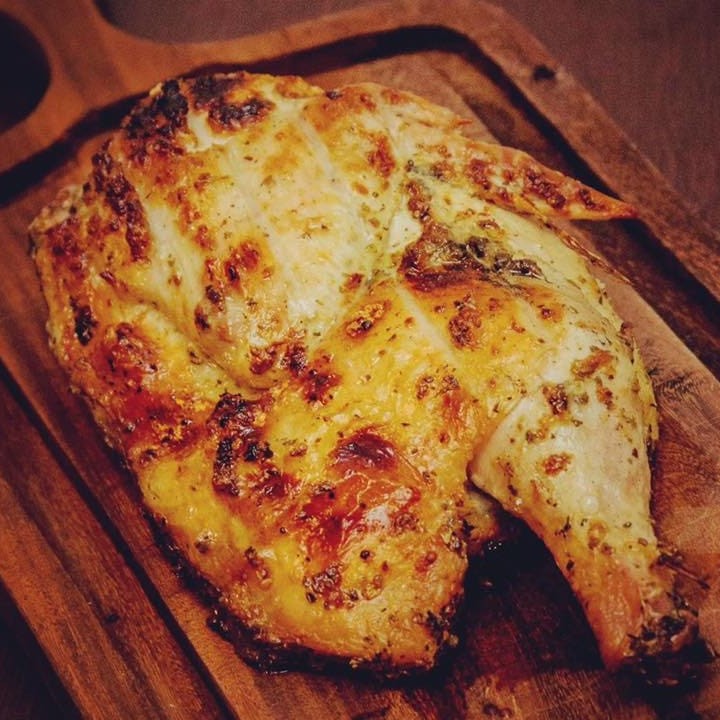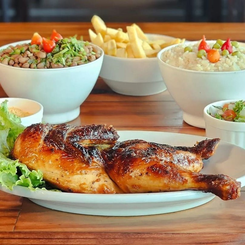 Coxa sobrecoxa de frango, feijão macassar, arroz refogado, vinagrete, farofa e batata frita.
