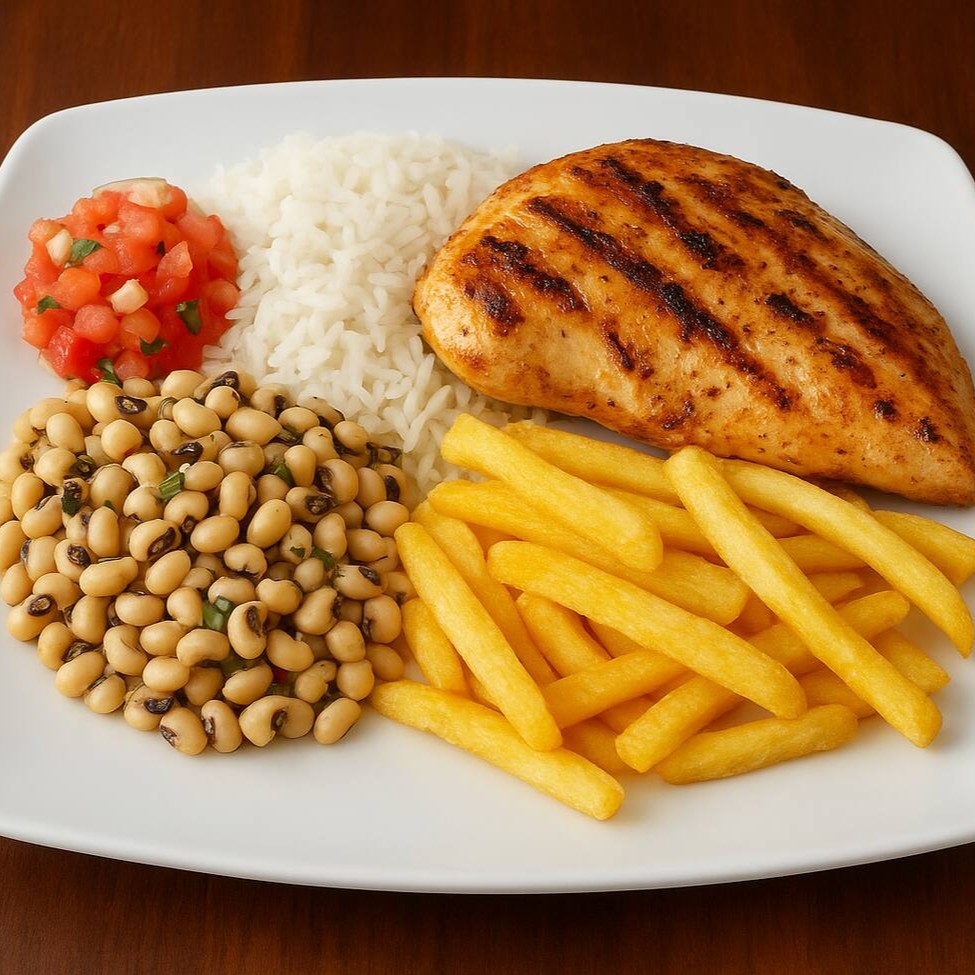 Peito de frango, feijão macassar, arroz refogado, vinagrete, farofa e batata frita.