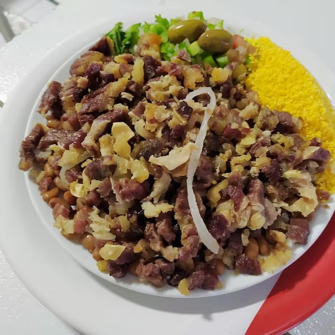 Feijão Macassar, Arroz, Charque, Vinagrete, Farofa.