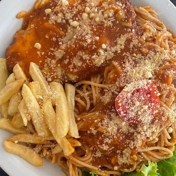 Macarrão, Filé de Frango, Molho da casa, Batata Frita, Queijo parmesão