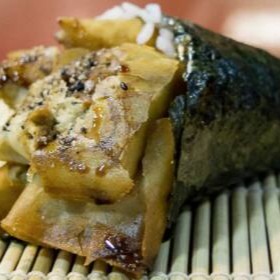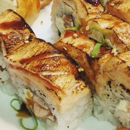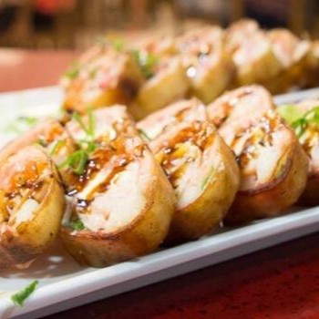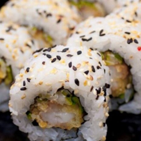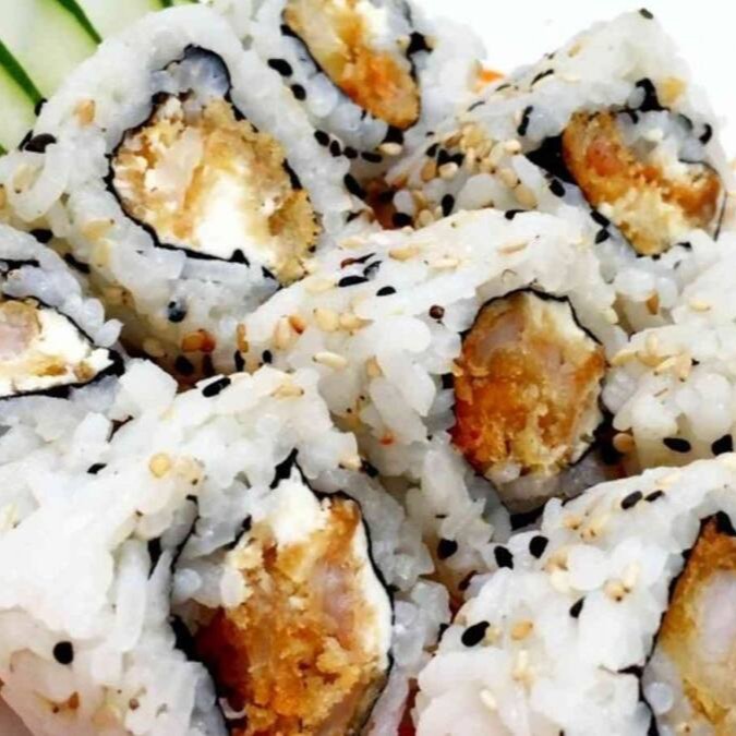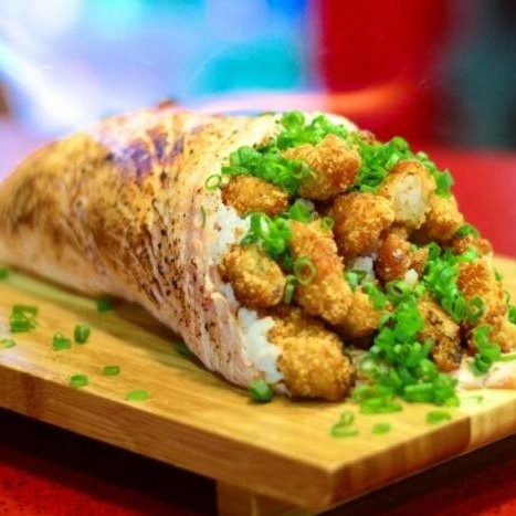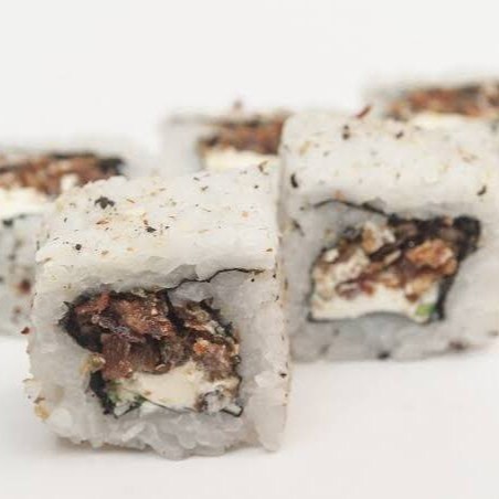 Envolto em massa de rolinho primavera por fora, sem alga com arroz cream cheese, cebolinha, gergelim e teriyaki