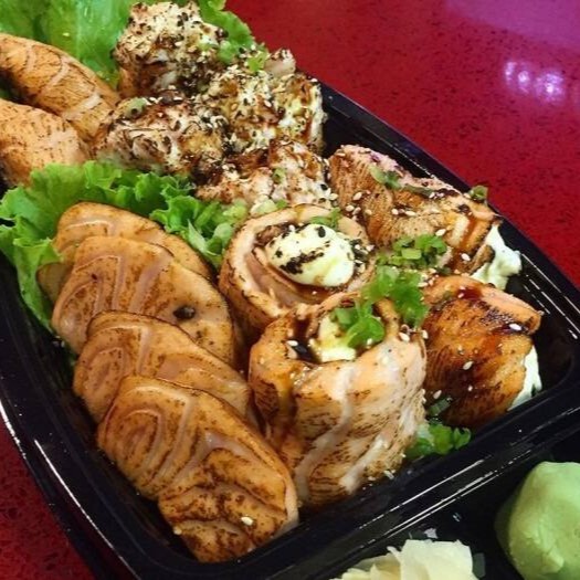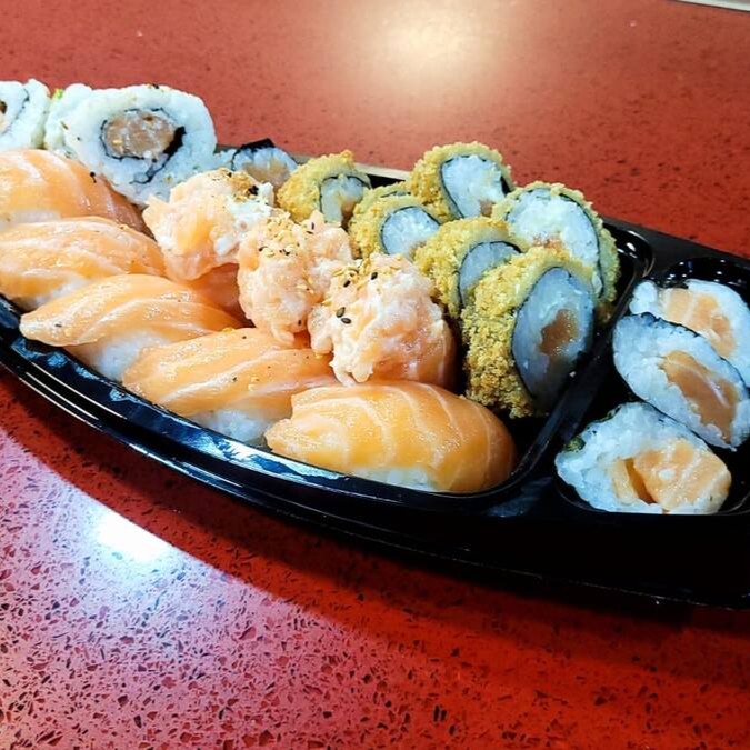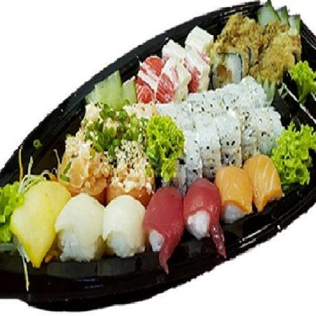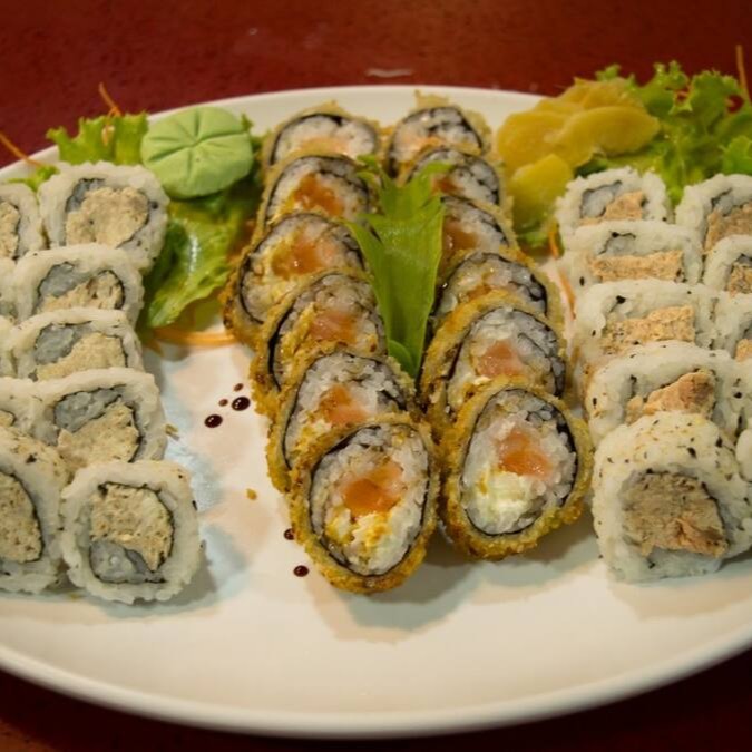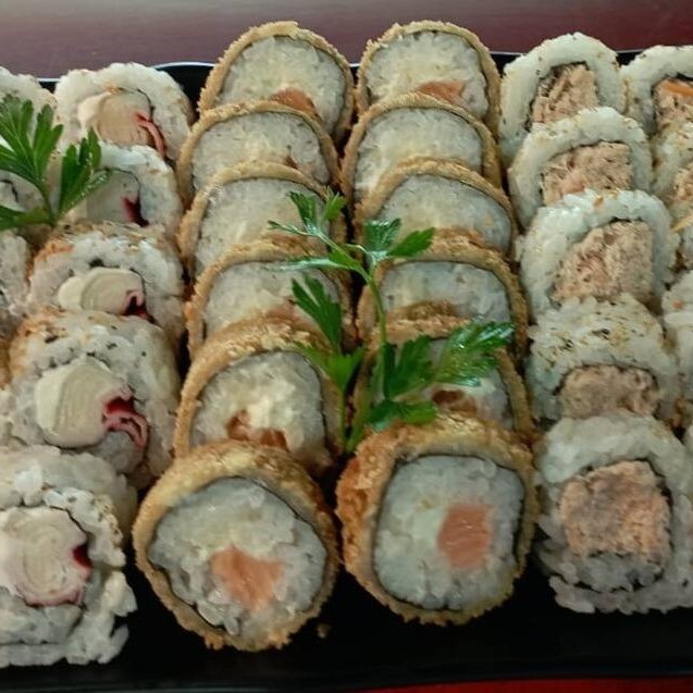 Sushis De Peixes Variados(salmao atum agulhao e kani): 6 cariocas, 14 uramakis variados, 4 jo jo, 7 niguiris sushis variados, 6 kani queijo, 8 hossomakis variados.