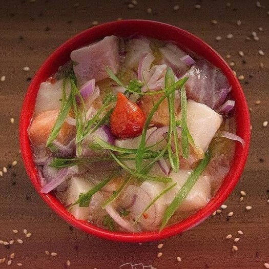 Salmão, camarão, polvo, atum e agulhão marinados comlimão e azeite com cebola roxa, pimenta biquinho, dedo de moça, tagorashi e cebolinha.