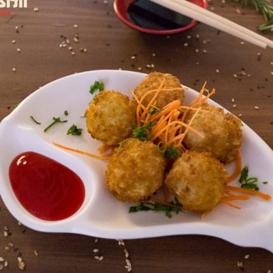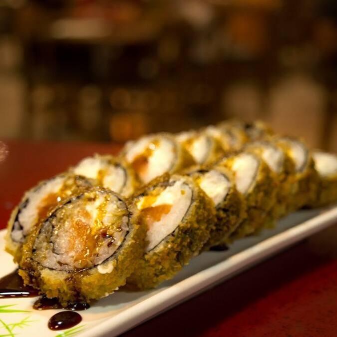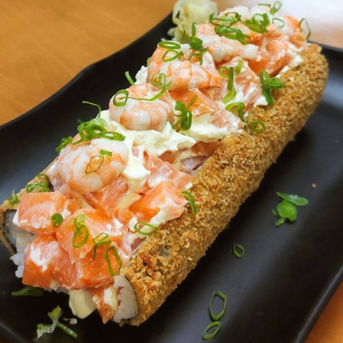 Salmão e camarão empanado com cream cheese, cebolinha e gergelim.