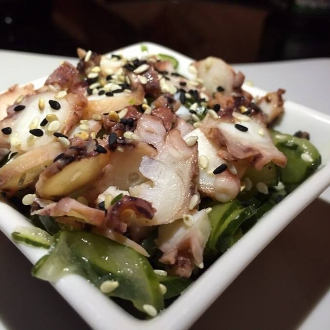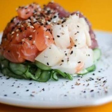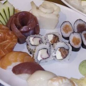 Salmão, atum. Agulhão, polvo e kani. Acompanha pepino.
