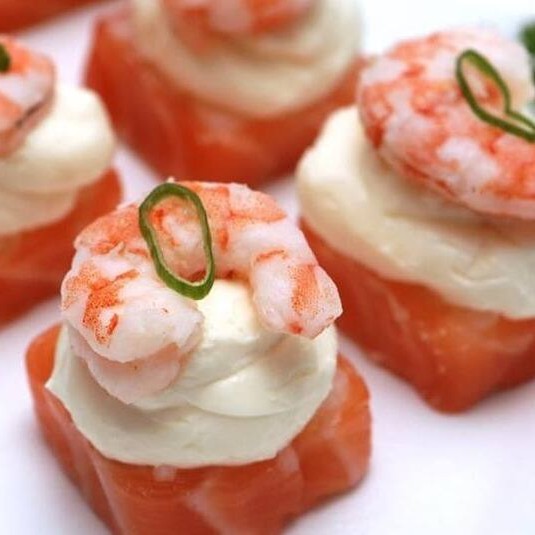 Cubos de salmao com creme chesse e camarao natural por cima, teriaki, cebolinho e gergilim