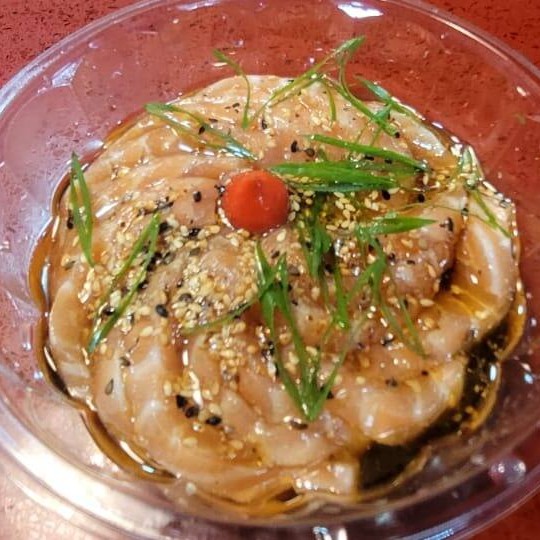 Salmão marinado em limão e azeite com cebola roxa, pimenta biquinho, dedo da maçã, tagoreshi e cebolinha.