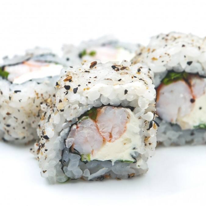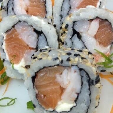 Camarão, e salmão com cream cheese, cebolinha e gergelim.