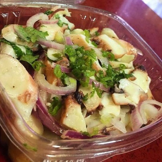 Polvo marinado em limão e azeite, com cebola roxa, pimenta biquinho, dedo de moça, tagorashi e cebolinha.