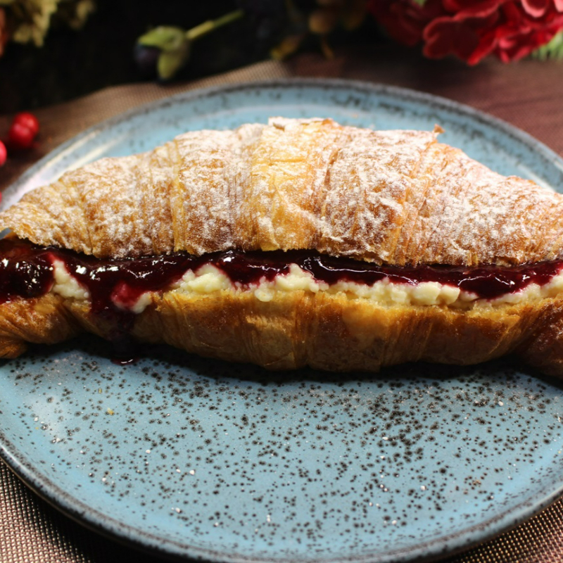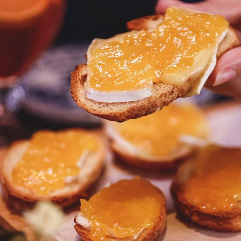 Torrada de pão italiano com queijo brie e geleia de damasco.