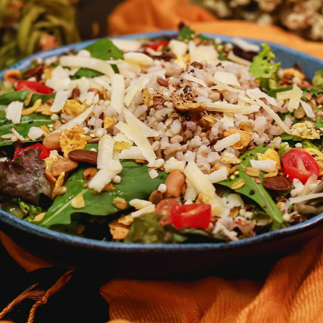 Mix de alface crespa verde e roxa, rúcula, arroz 7 grãos, granola salgada, tomate cereja, queijo parmesão ralado, molho de mostarda e mel e molho especial. Observação: * Todos os molhos vão a parte! *Alergênicos: o molho especial contém ovo.