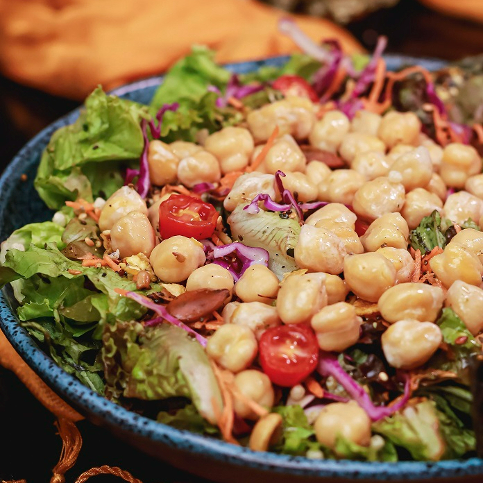 Mix de alface crespa verde e roxa, grão de bico, cenoura ralada, repolho roxo, tomate cereja, granola salgada e molho especial. Observação: * Todos os molhos vão a parte! *Alergênicos: o molho especial contém ovo.