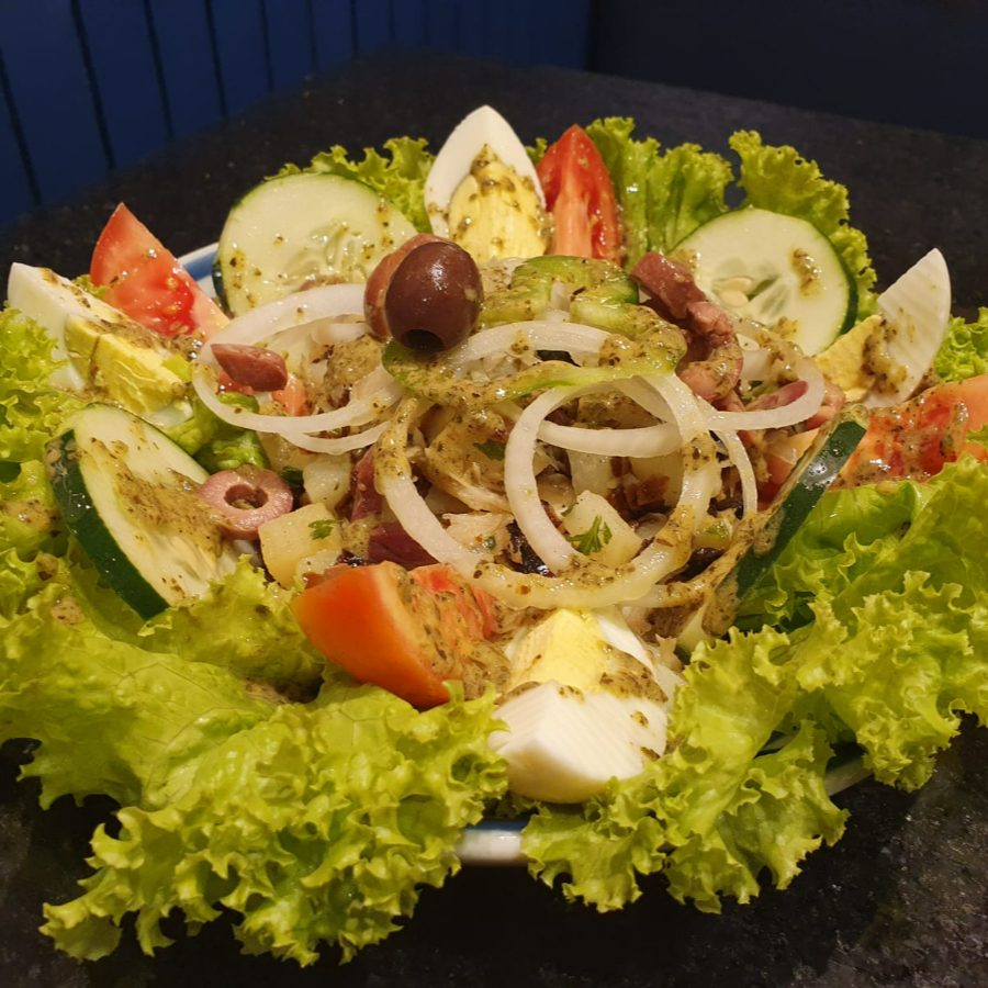 Salada de alface crespa, bacalhau em lascas regado no azeite, salsa, batata inglesa, tomate, cebola, pimentão, pepino, rabanete, azeitona preta fatiada e molho especial. Observação: * Todos os molhos vão a parte! *Alergênicos: o molho especial contém ovo.