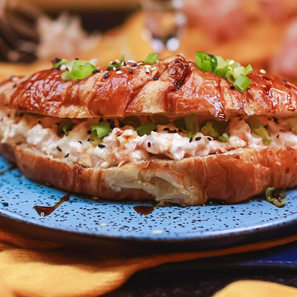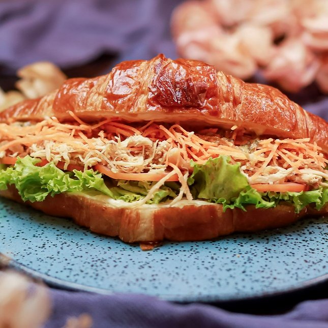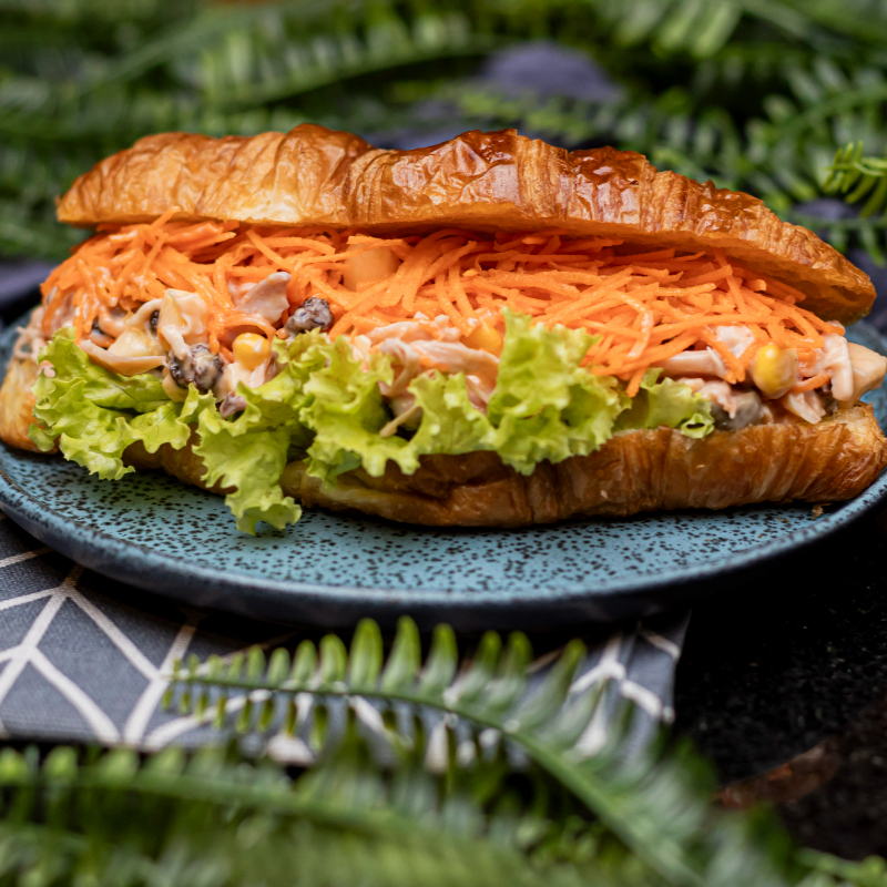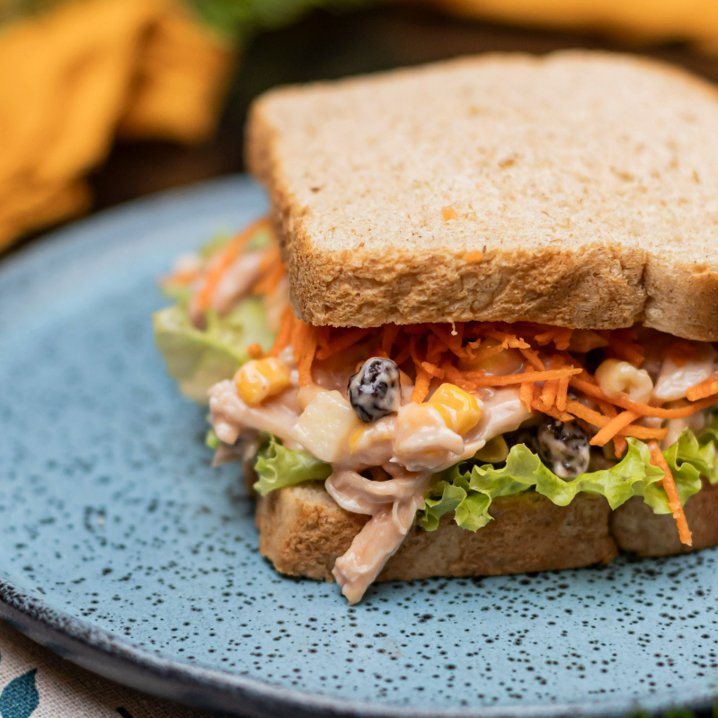 Pão integral, frango defumado desfiado, uva passa, maçã, milho, azeitona verde fatiada, molho rosé, alface crespa e cenoura.
