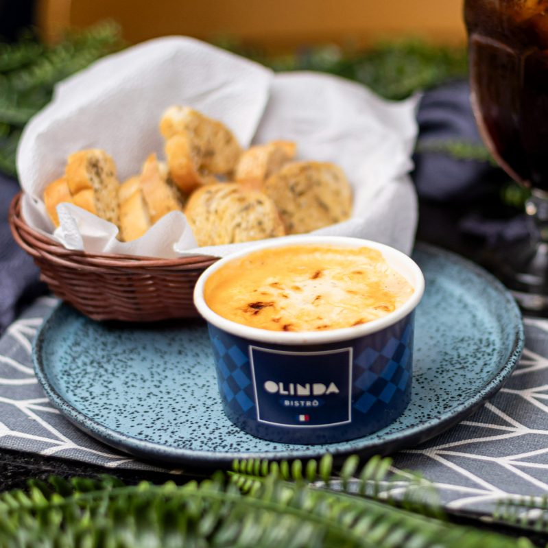 Camarão, molho de tomate, catupiry, molho bechamel e parmesão. Acompanha torrada da casa.