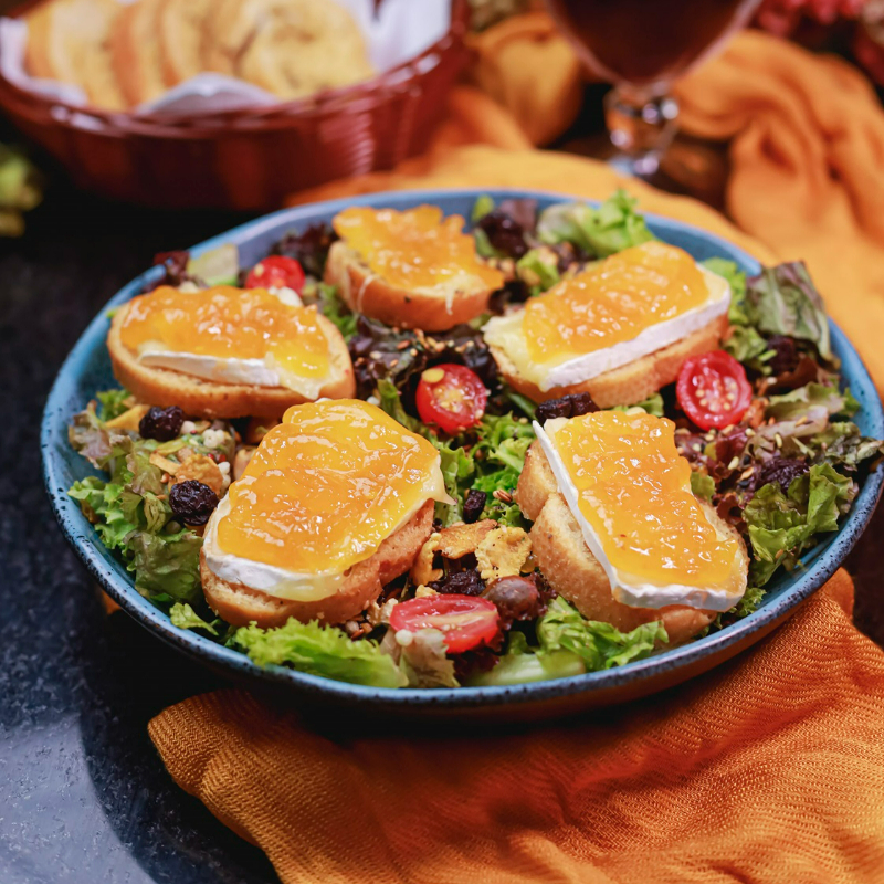 Mix de alface crespa verde e roxa, torrada com queijo brie e geleia de damasco, tomate cereja, uva passa, granola salgada e molho especial. Observação: * Todos os molhos vão a parte! *Alergênicos: o molho especial contém ovo.