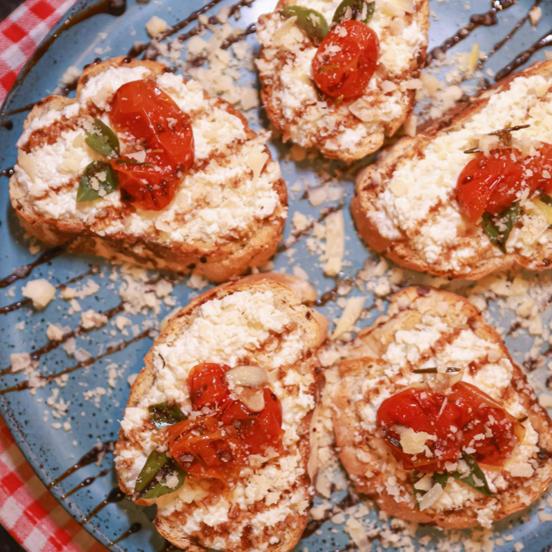 Torrada de pão de ervas servida com creme de ricota e gorgonzola, tomate confit, manjericão, queijo parmesão ralado e molho teriyaki.