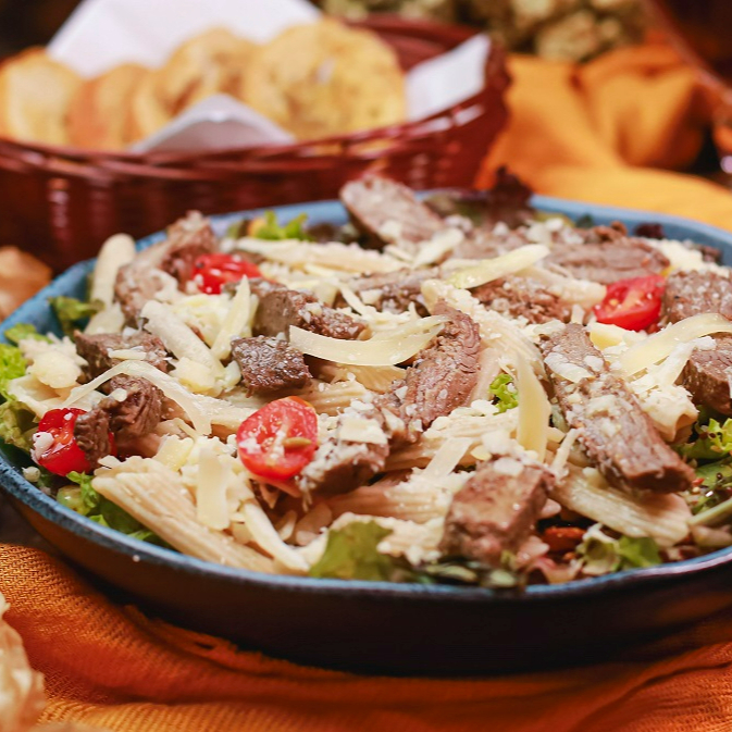Mix de folhas, filé mignon, penne integral, tomate cereja, granola salgada, parmesão ralado e molho especial. Observação: * Todos os molhos vão a parte! *Alergênicos: o molho especial contém ovo.