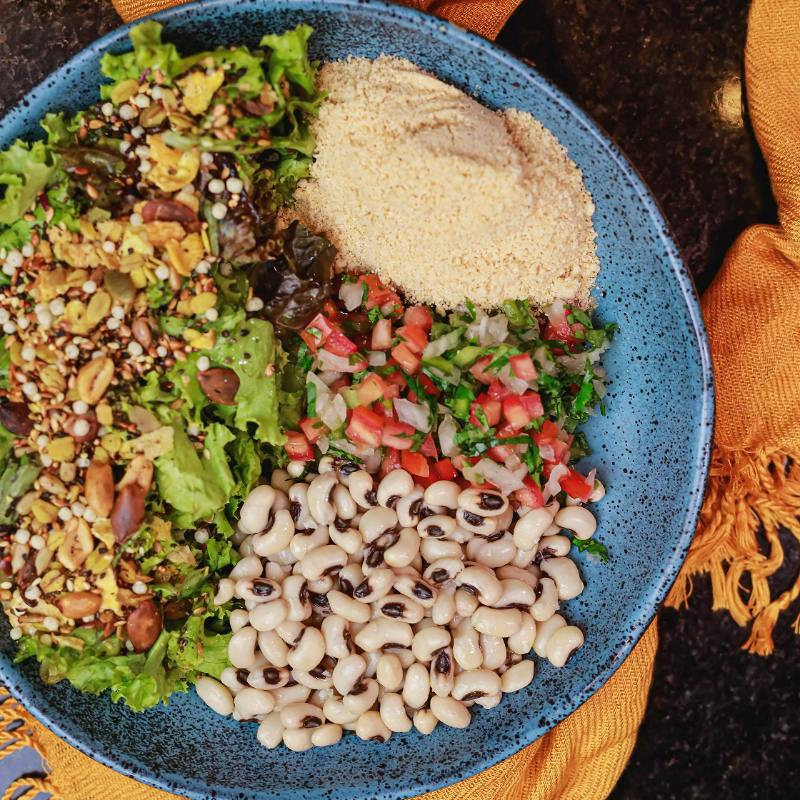 Mix de alface crespa verde e roxa, granola salgada, feijão macassar, vinagrete, farofa e molho especial. Observação: * Todos os molhos vão a parte! *Alergênicos: o molho especial contém ovo.