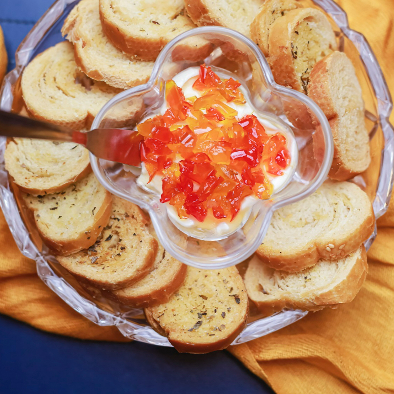 Combinação perfeita de cream cheese e geleia de pimentões servidos com torrada da casa.