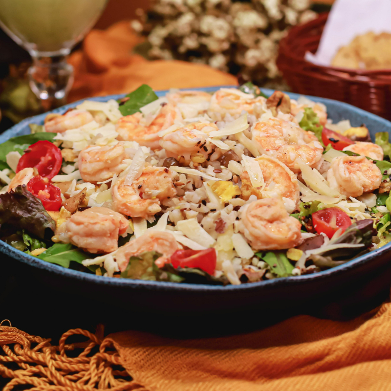 Mix de alface crespa verde e roxa, rúcula, arroz 7 grãos, camarão, granola salgada, tomate cereja, queijo parmesão ralado, molho de mostarda e mel e molho especial. Observação: * Todos os molhos vão a parte! *Alergênicos: o molho especial contém ovo.