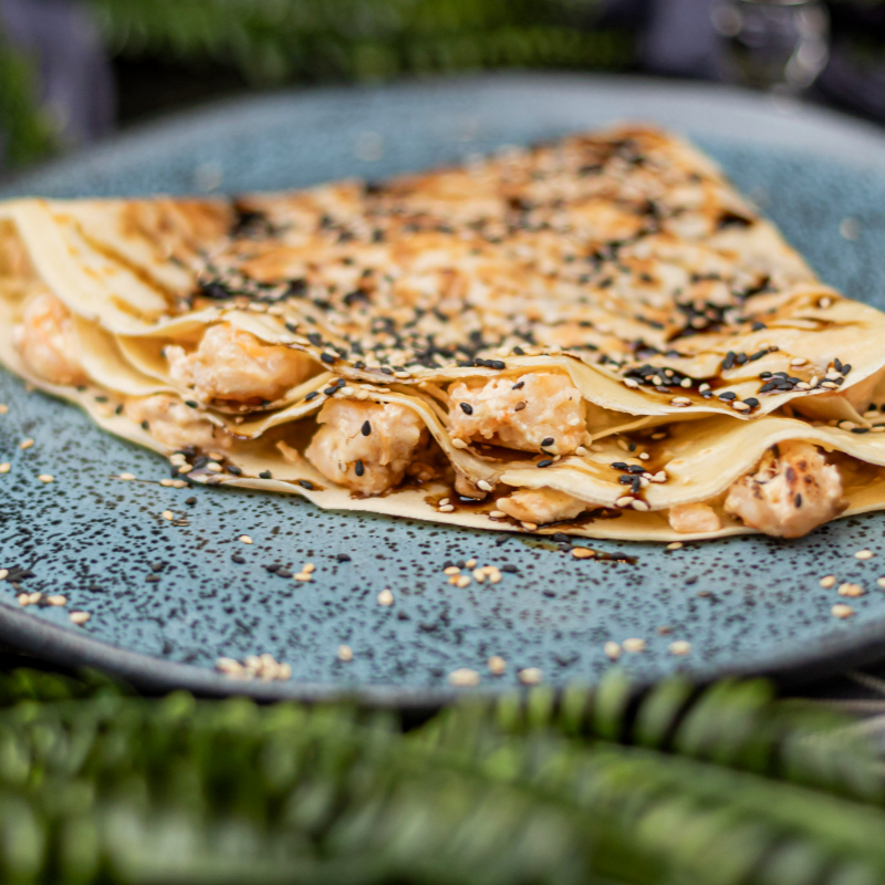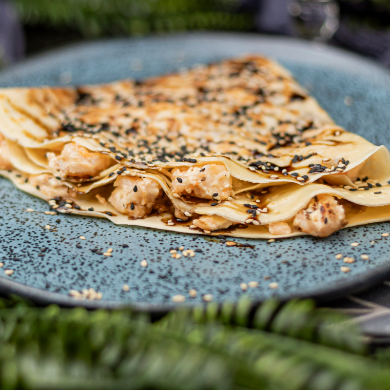 Camarão, cream cheese, gergelim torrado e molho teriyaki.