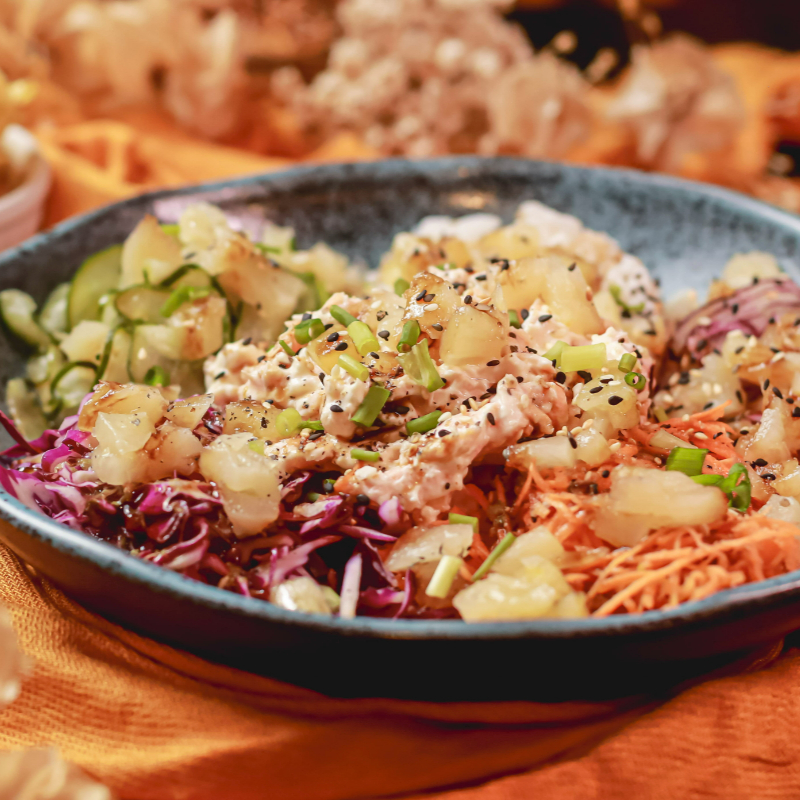 Salmão, camarão, cream cheese, sunomono, arroz de sushi, cenoura, repolho roxo, cebola roxa, abacaxi em cubos, cebolinho, gergelim torrado, molho teriyaki e molho especial. Observação: * Todos os molhos vão a parte! *Alergênicos: o molho especial contém ovo.