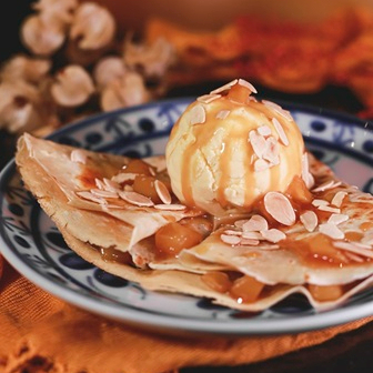 Maçã caramelizada com um toque de cravo e canela, caramelo salgado, amêndoas laminadas e sorvete de creme.