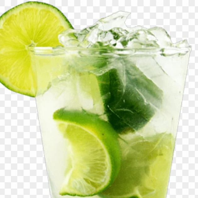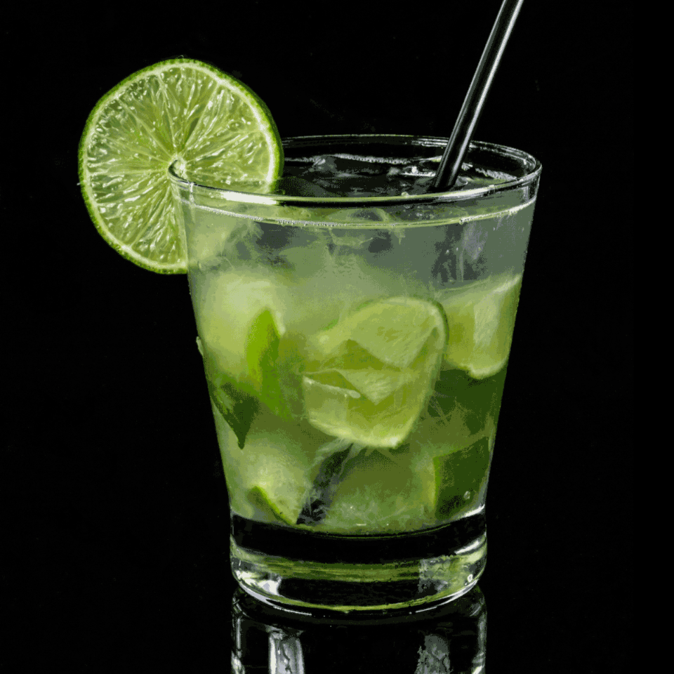 Limões cortados e macerados com açúcar, batidos na coqueteleira com duas doses de cachaça e gelo."
