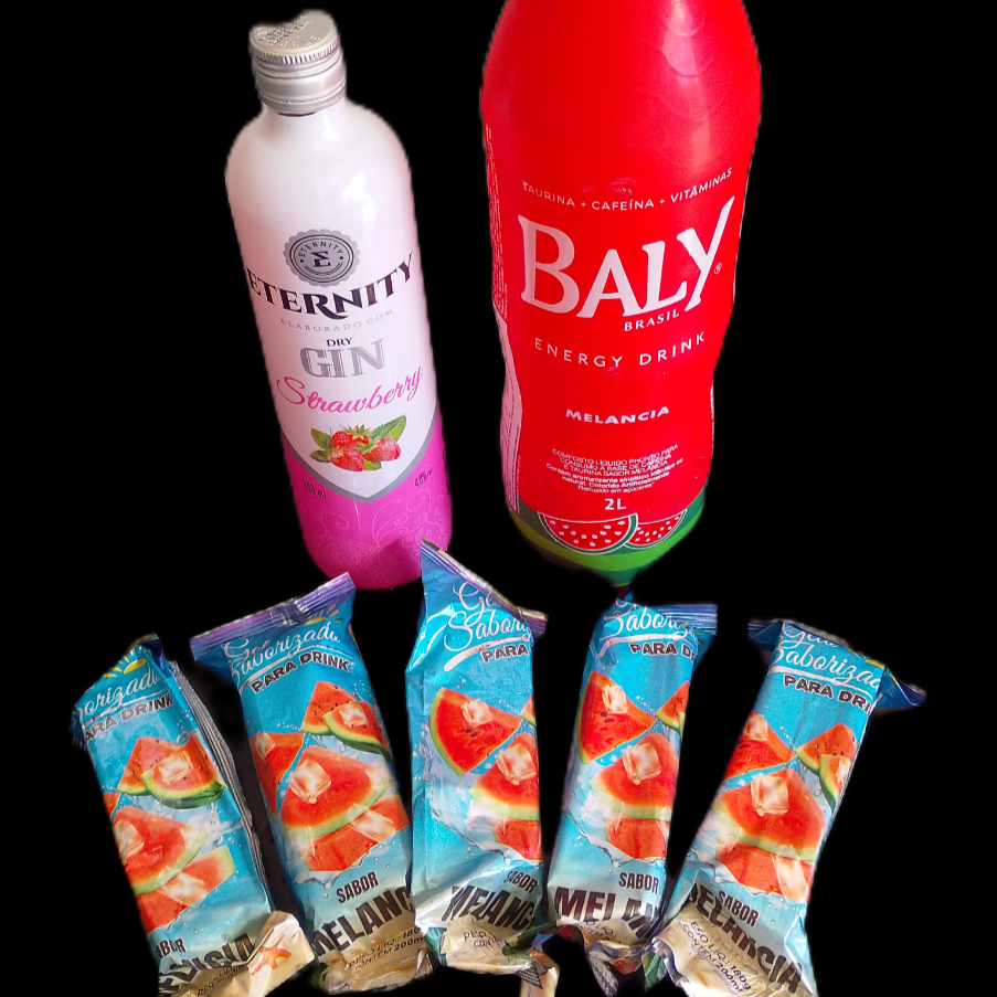 Combo 1 litro de Gin morango ou melancia 2 litros de energético Baly, mais 5 gelos saborizado.