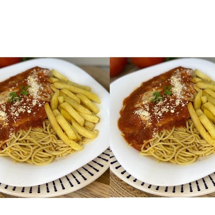 Duas parmegianas de frango com fritas no capricho, Acompanhadas de macarrão temperado ou arros, com aquele sabor que todos amam.