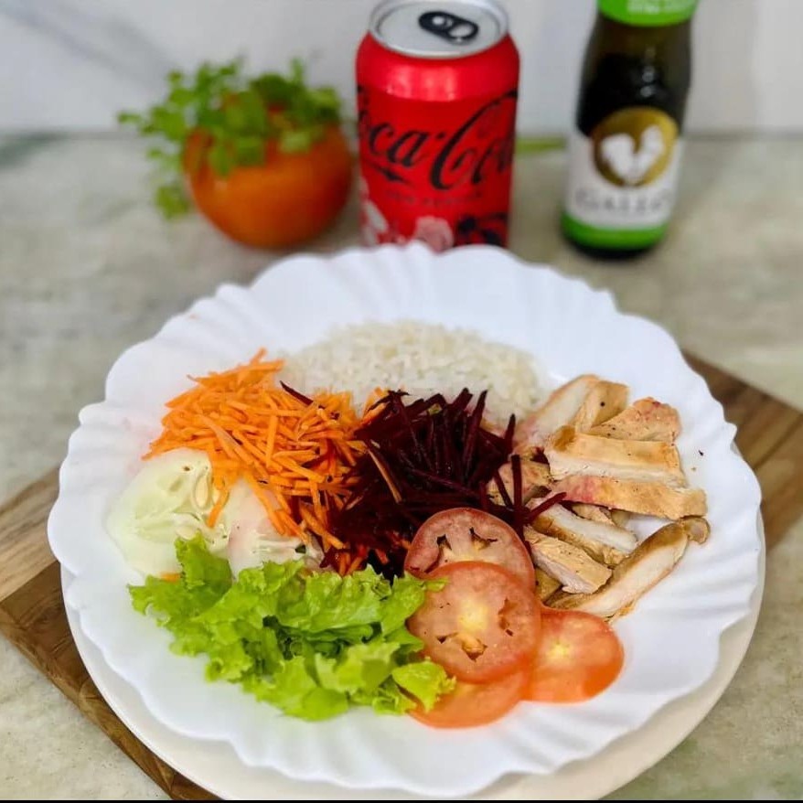 Deliciosa marmita de iscas de filé de frango, acompanhado de arroz branco e uma saborosa salada crua de alface, tomate, pepino, beterraba e cenoura raladas, levemente regada com fios de azeite extra virgem. + \coca zero