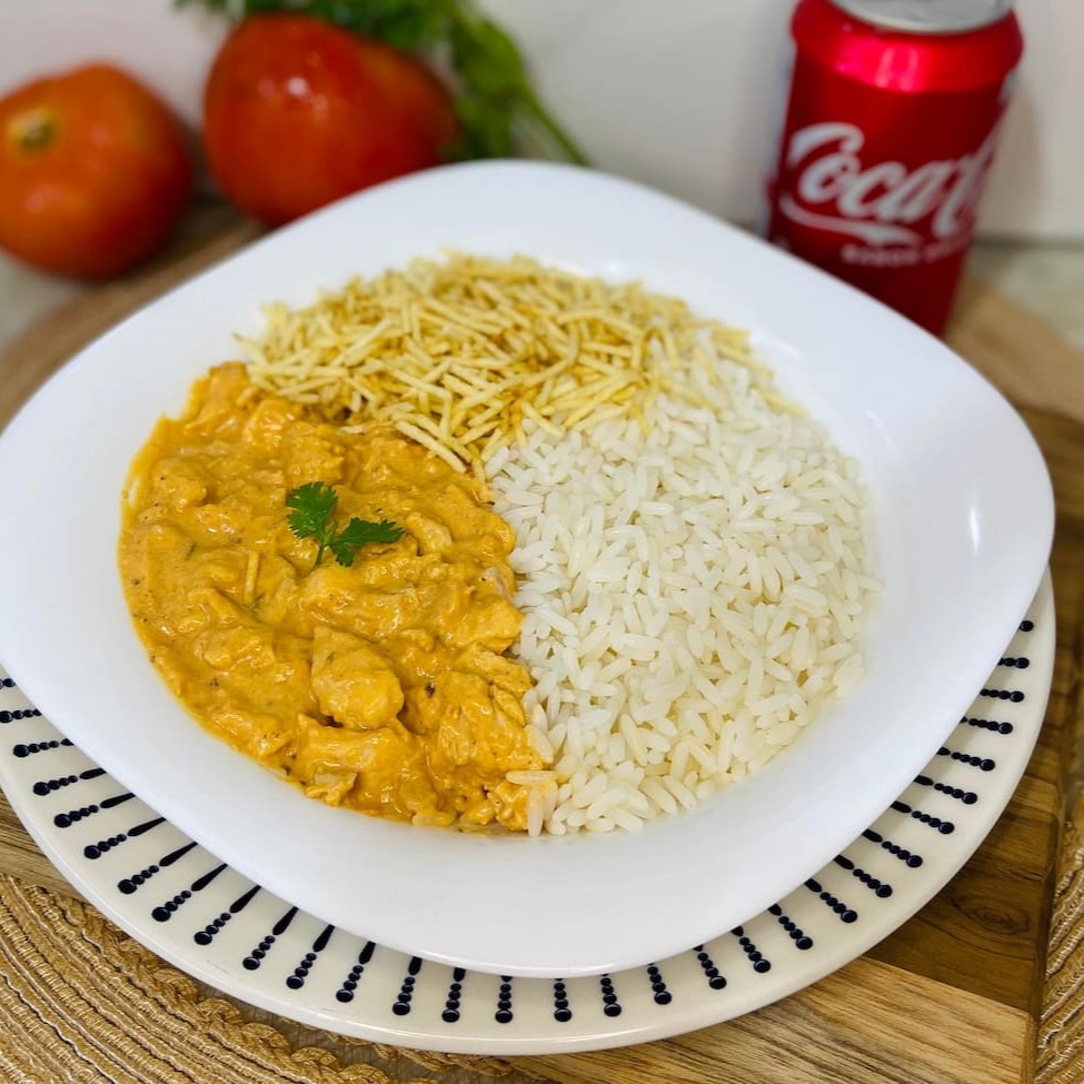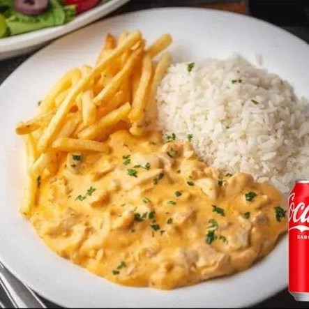 Nosso delicioso strogonoff de frango com arroz branco soltinho e uma porção de batata frita no capricho. + Coca