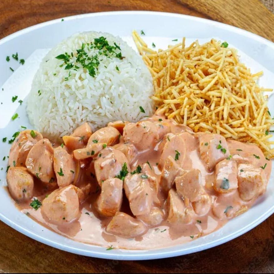 Nosso delicioso strogonoff de frango com arroz branco soltinho e uma porção de batata frita.
